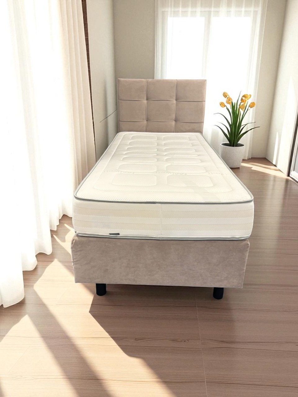 Ervaar ultiem slaapcomfort met deze compacte boxspring in de maat 90×200 cm. Het strakke design in de moderne kleur suède licht bruin past moeiteloos in iedere slaapkamer – van minimalistisch tot luxe.